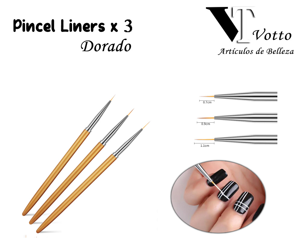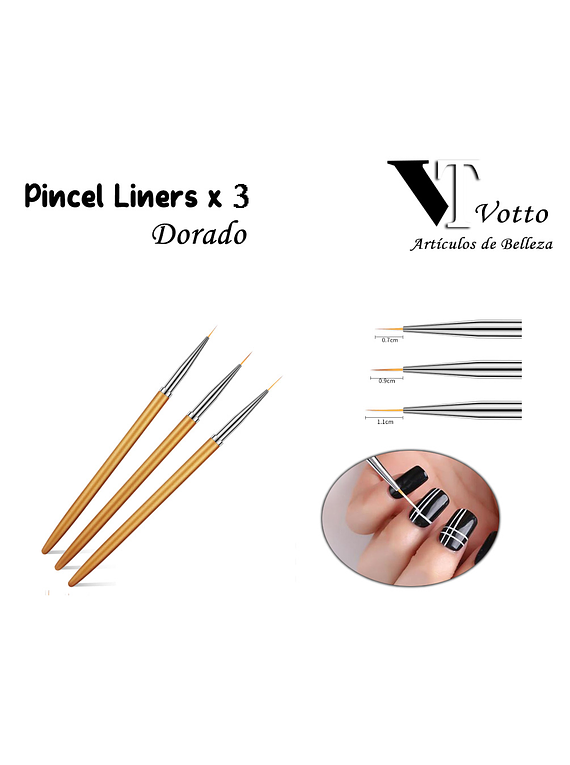 Producto: Pincel Liners x3 Dorado Material: Pelo Sintetico. Descripcion: Usado para realizar diseños a mano alzada. Medias : 6mm 8mm 12mm